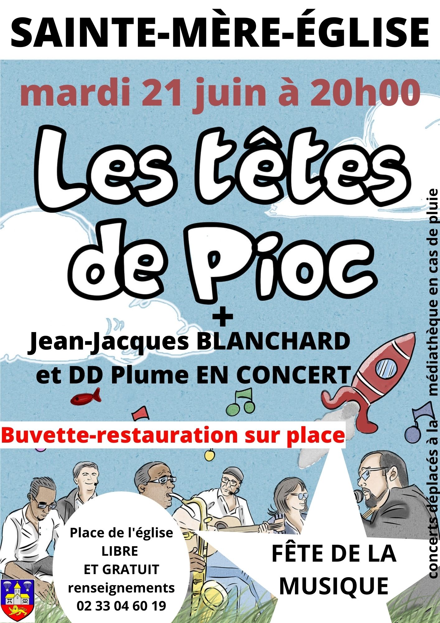 En première partie, vous pourrez écouter Jean-Jacques BLANCHARD et DD Plume (standards de la chanson française et chants de mer). En seconde partie, ce sont LES TÊTES DE PIOC qui vous emmèneront dans leurs compositions originales (chanson française rythmée d’une ambiance festive). Concerts libres et gratuits. Buvette et restauration sur place. Repli à la médiathèque en cas d’intempérie.