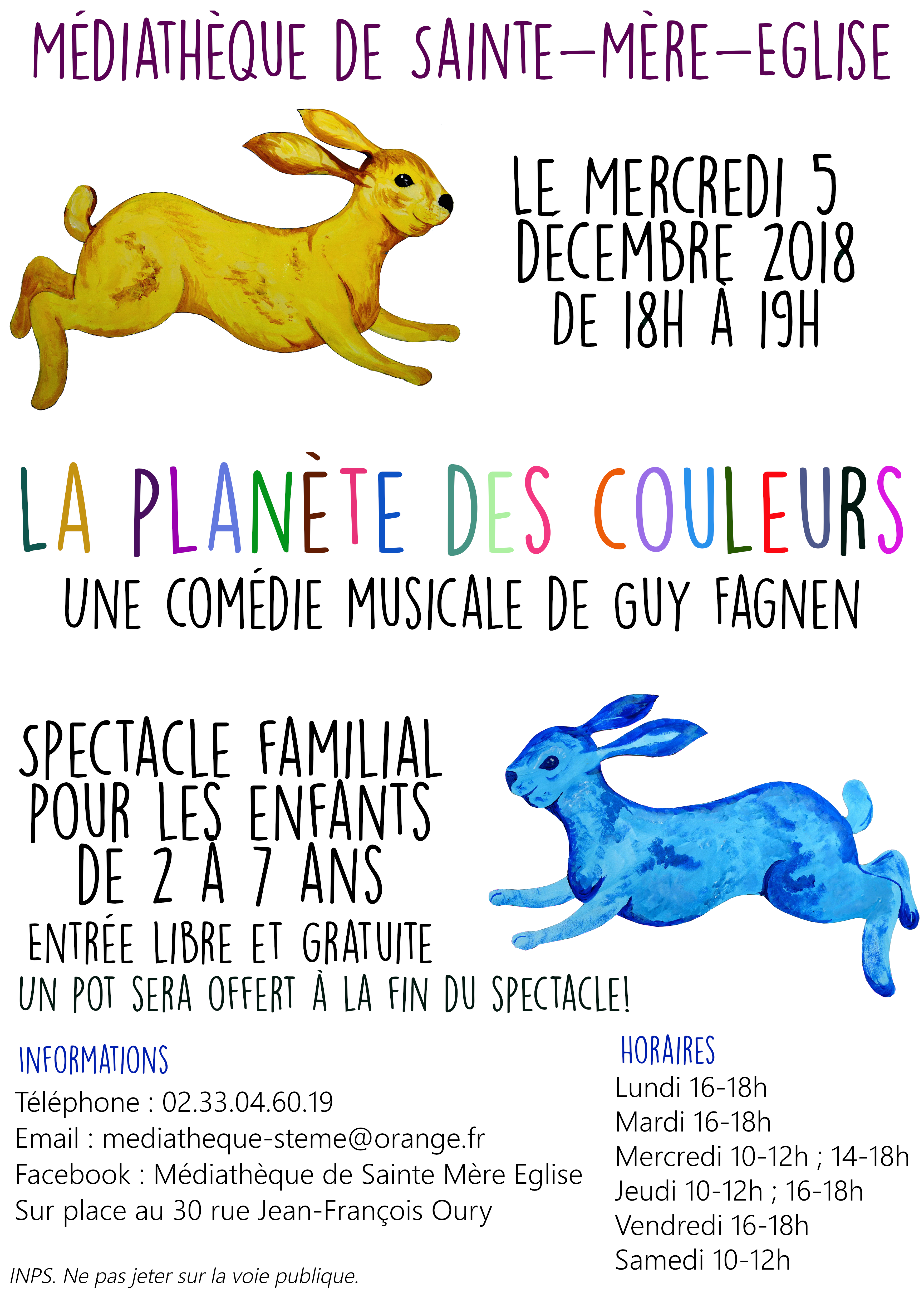 Mercredi 5 décembre à 18h00 en la médiathèque de Sainte-Mère-Eglise : spectacle familial présenté par Guy Fagnen. Comédie musicale « La planète des couleurs », pour les enfants de 2 à 7 ans. Il s’agit d’un conte inédit, raconté de façon vivante et interactive et qui parle des couleurs au sens chromatique mais aussi, mais surtout, de façon métaphorique, des différences et du métissage. Durée de ce concert libre et gratuit : 1h00. Un pot sera offert à la fin du spectacle.